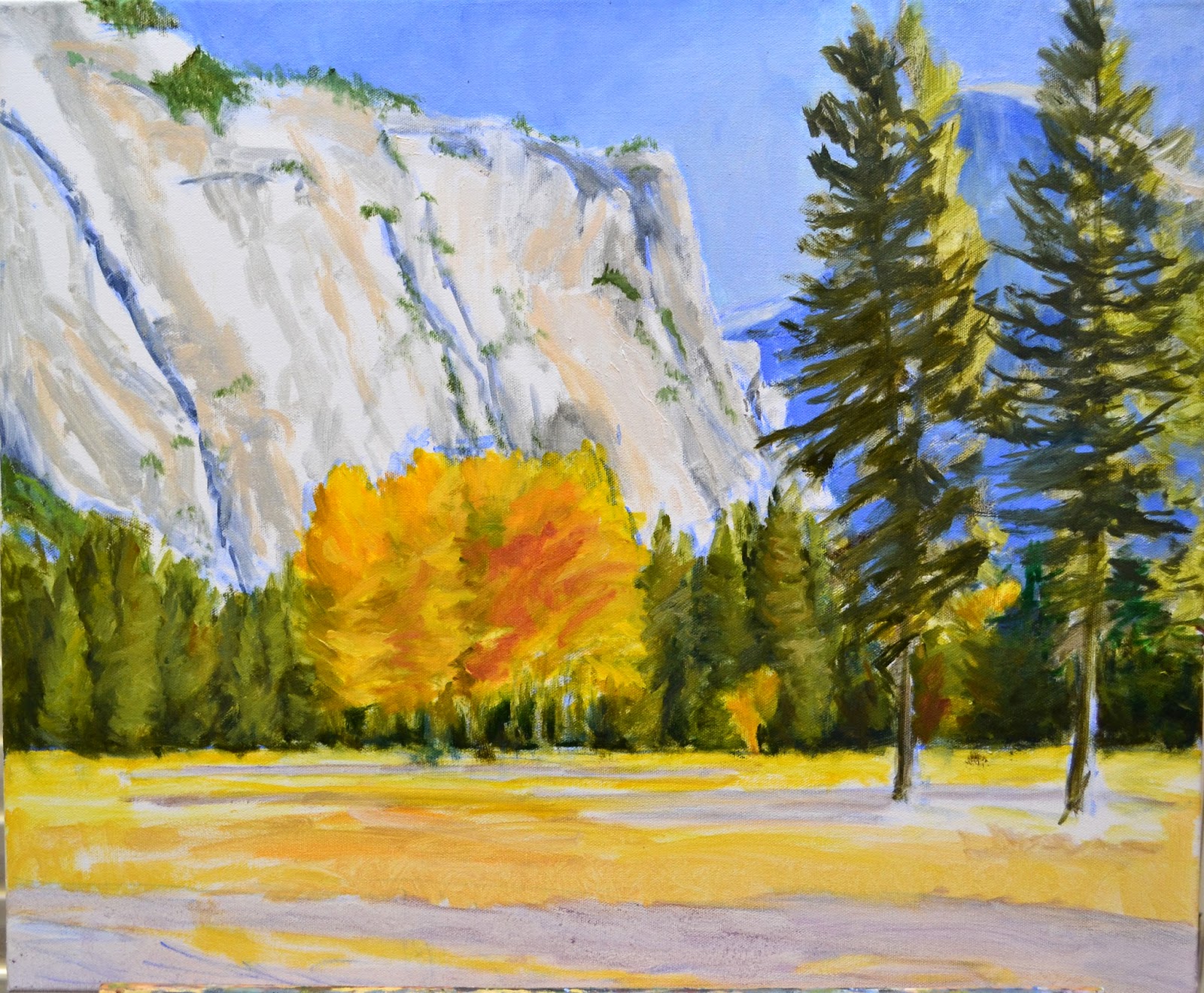 Here is the next painting that I'm working on related to my visit to Yosemite National Park. It is blocked in and I've begun to add paint. It is a very sunny day and I want to keep the colors bright and clear. Hopefully I can make it work. I'll keep you posted. Stay tuned.